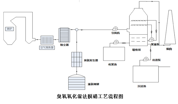 ? ? ? ?臭氧脫硝主要是利用臭氧的強(qiáng)氧化性將 NO 氧化為高價(jià)態(tài)氮氧化物, 然后在洗滌塔內(nèi)將氮氧化物吸收轉(zhuǎn)化為溶于水的物質(zhì),達(dá)到脫除的目的。在典型煙氣溫度下,臭氧對(duì) NO 的氧化效率可達(dá)85%以上,結(jié)合尾部濕法洗滌,脫硝效率也在 O3/NO 摩爾比為0.9時(shí)達(dá)到86.27%。以下為臭氧脫硝工藝流程圖。