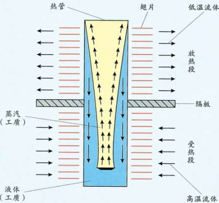 熱管工作原理:典型的重力熱管如圖所示,在密閉的管內(nèi)先抽成真空,在此狀態(tài)下充入適量工質(zhì),在熱管的下端加熱,工質(zhì)吸收熱量汽化為蒸汽,在微小的壓差下,上升到熱管上端,并向外界放出熱量,凝結(jié)為液體。冷凝液在重力的作用下,沿?zé)峁軆?nèi)壁返回到受熱段,并再次受熱汽化,如此循環(huán)往復(fù),連續(xù)不斷的將熱量由一端傳向另一端